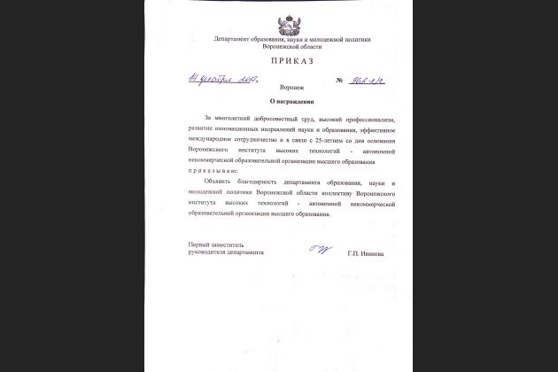 Департамент образования, науки и молодежной политики Воронежской области выразил благодарность Воронежскому институту высоких технологий за многолетний добросовестный труд, а также развитие инновационных направлений науки и образования.