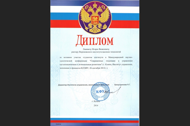 В конференции приняли участие студентки Воронежского института высоких технологий Пивоварова Юлия и Шушкова Оксана. Они выступили с докладом «Характеристики корпоративной культуры в ВУЗе при работе со студентами и выпускниками» в секции «Корпоративная культура организации и основные факторы на неё влияющие» и были награждены дипломами.