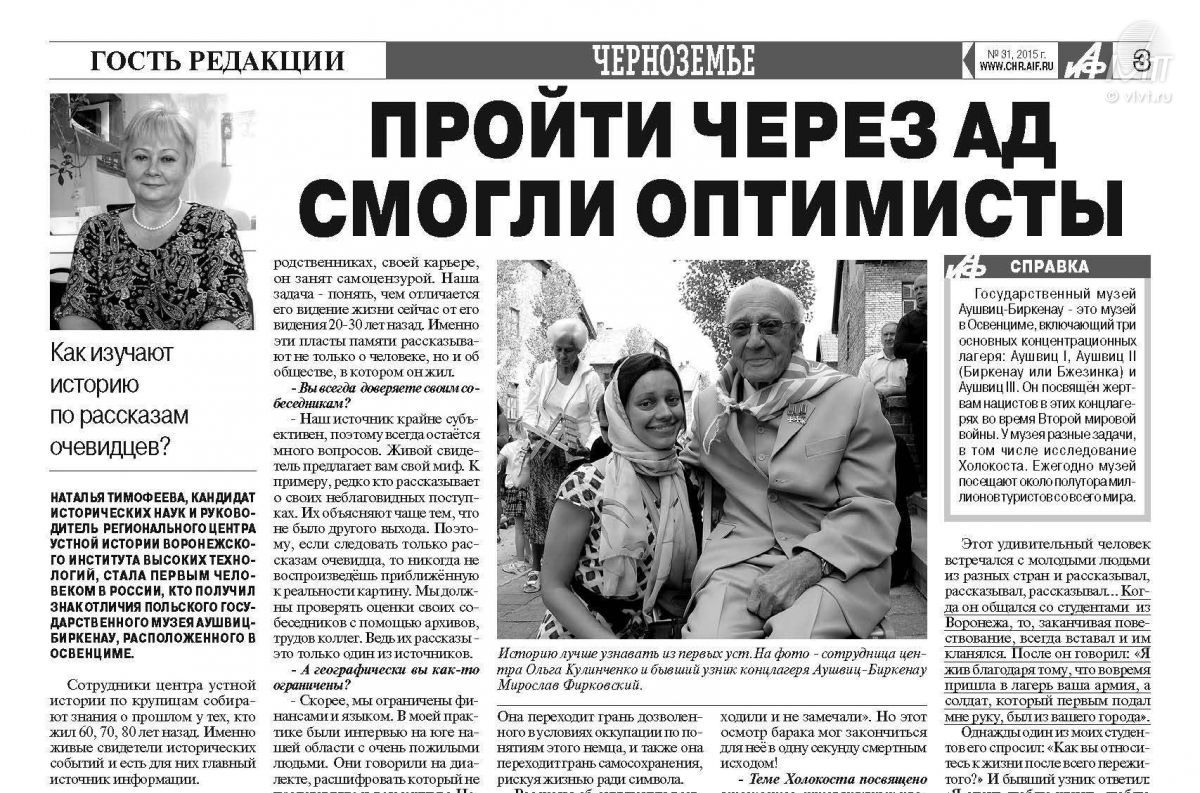 11-16 августа 2015 г. сотрудница Регионального центра устной ВИВТ истории А.-М. И. Карафизи приняла участие в «Шестом европейском ворк-шопе, посвященном памяти об Аушвице».